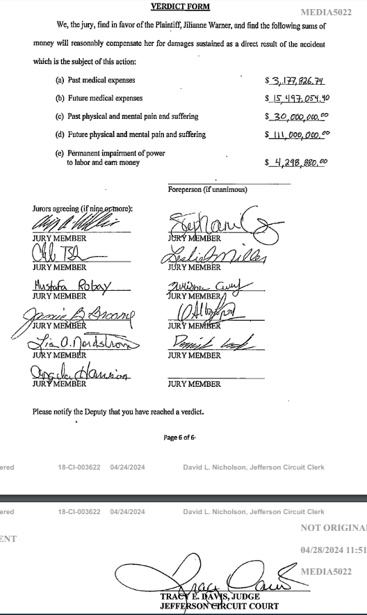 The record verdict form on damages ($163.9 million) in the recent Warner v. GEICO case in Louisville before Judge Tracy Davis returned 3-18-24. The plaintiff was paralyzed after being rear-ended by a tow truck working on a GEICO roadside service contract.